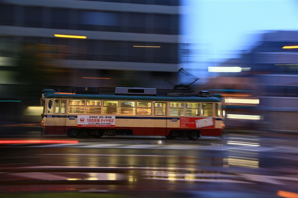 暴風雨直前の中を走る土佐電鉄(乗客は一人)…ホテルの玄関からやっと撮れた1枚