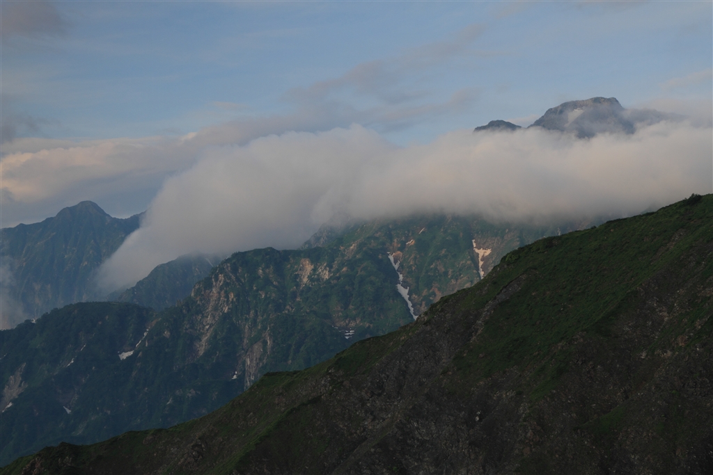 霧の入った五竜岳。後ろにチラリと見えるのは鹿島槍です。