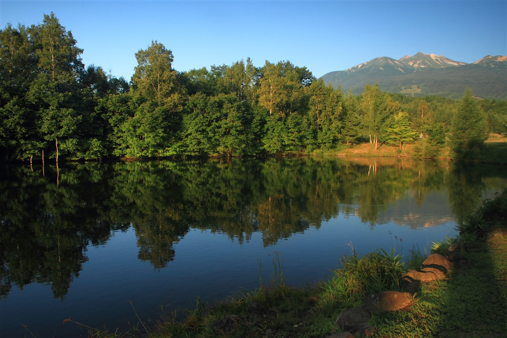 いがやレクリエーションセンター。池越しの乗鞍岳。