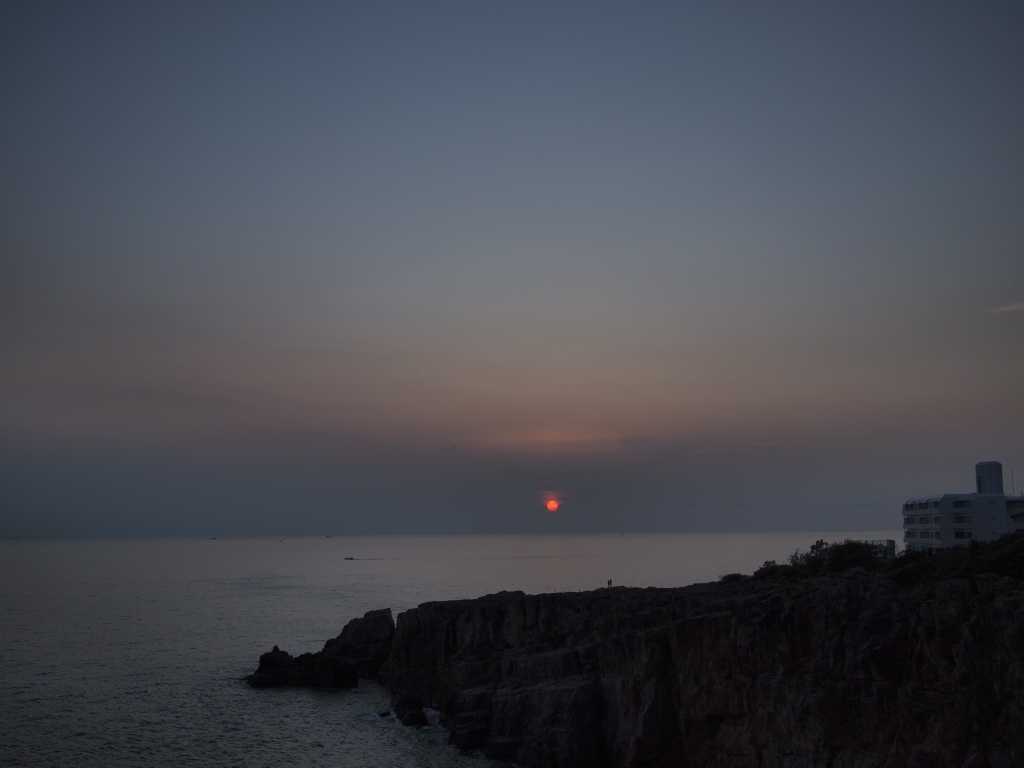 水平線に沈む前にモヤに隠れてしまいました