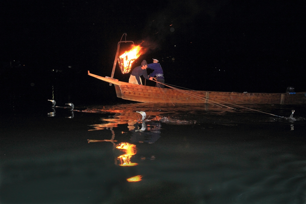 夜の鵜飼は真っ暗な中でかがり火だけが頼り(ストロボ閃光で何とか撮れる)