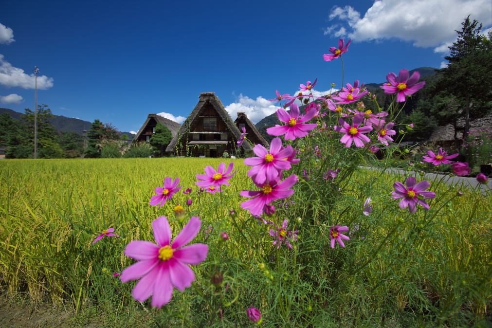 合掌造りとコスモス