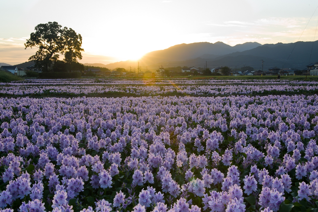 朝陽に染まるホテイアオイ