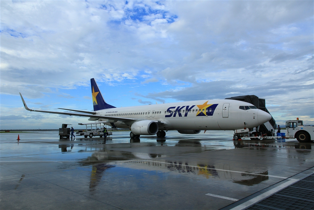 濡れた路面にも映るスカイマーク機(遠くに機影も)…雨のち晴れ