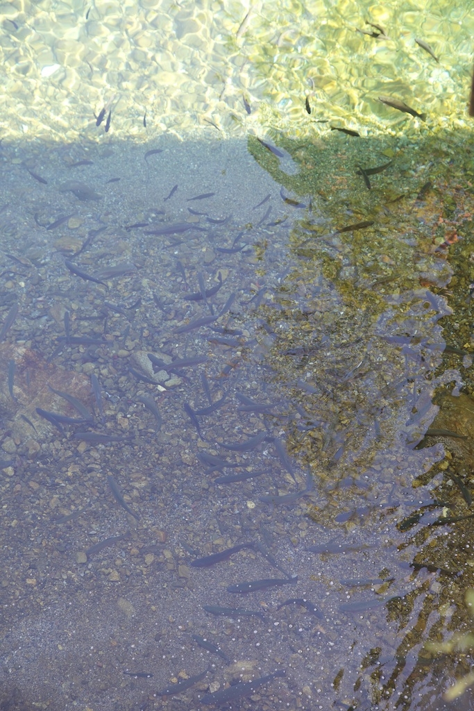 大きいものは30cmクラスのニジマスの大群が