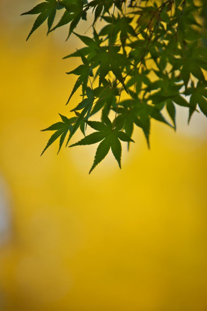 緑の葉っぱのモミジ(バック銀杏)