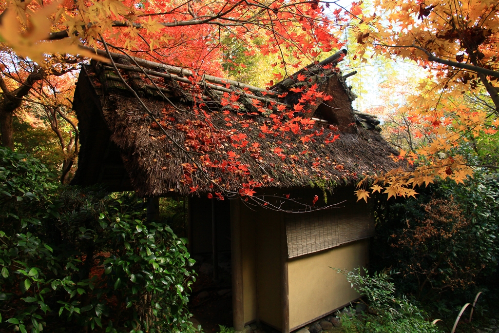 見事な紅葉に不釣合いな粗末な茅葺の勝手口