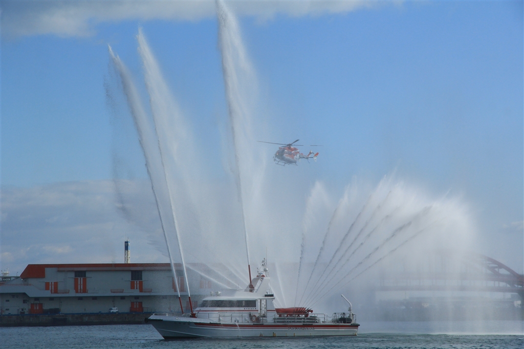海上消防隊の放水デモ(都合よく飛んできた救急救助ヘリとコラボで撮影した)