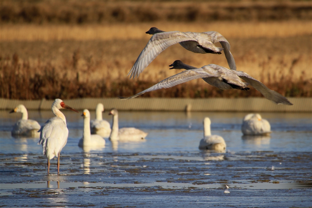 左手に珍鳥ソデグロヅルが写っています
