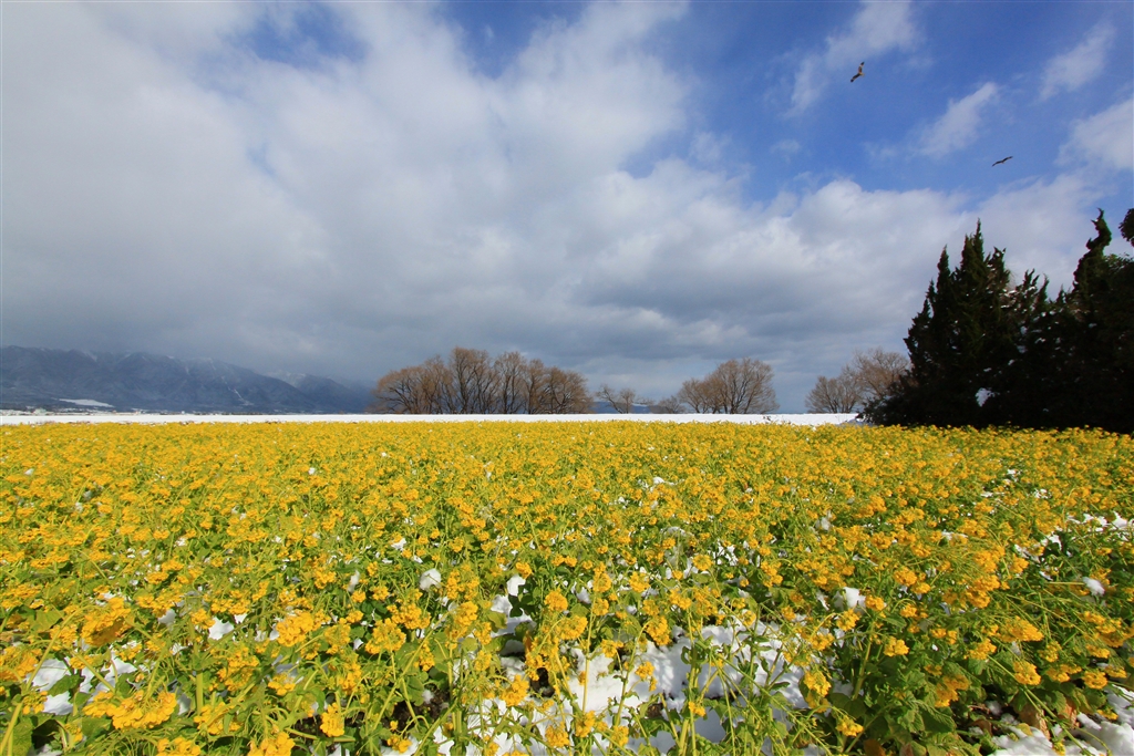 早咲きの菜の花(バックの冠雪した山は比良山)@守山のなぎさ公園(ラフォーレ近く)
