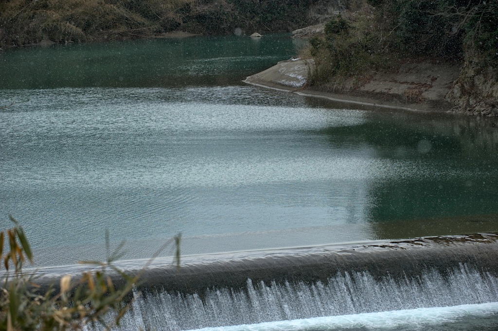 暗緑の櫛田川にも雪舞う
