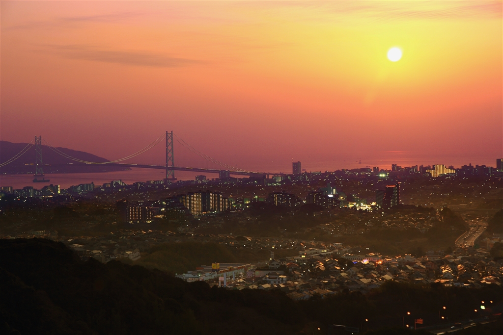 夕陽に染まり始めた明石海峡の街