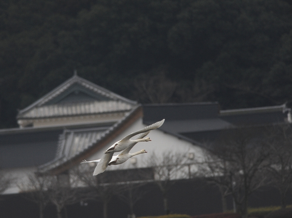 遠くで白鳥が旅立ち前の飛行訓練