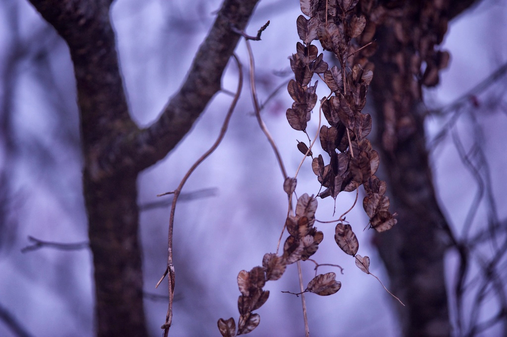 冬の名残の枯れ葉が樹幹を飾る
