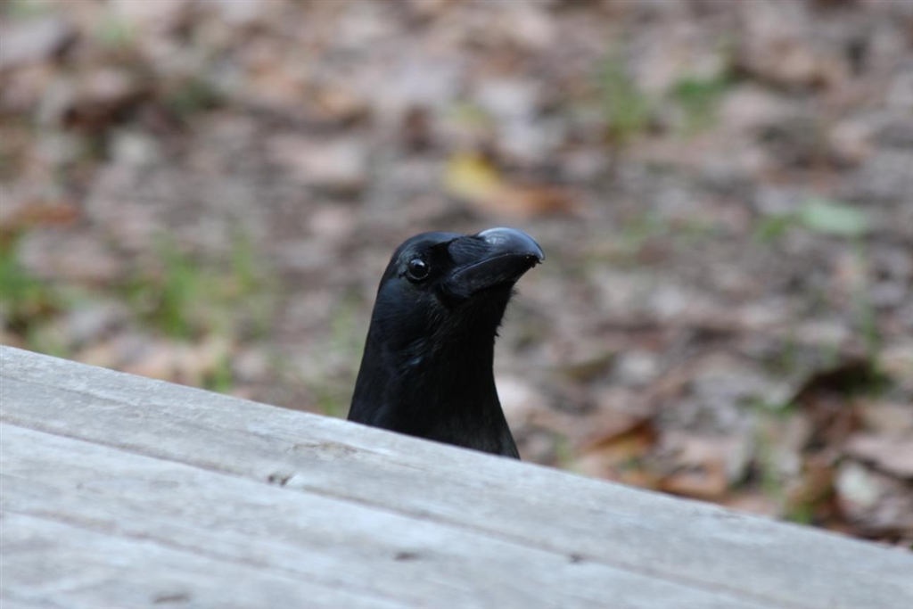 突然ベンチのしたから顔をだしたカラスさん。