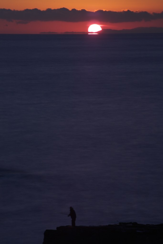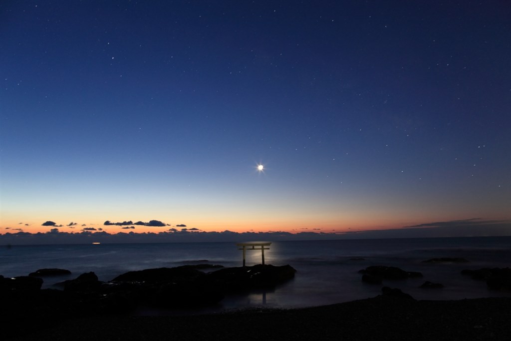 お久しぶりです^^鳥居と夕焼けに染まる海が綺麗ですねー