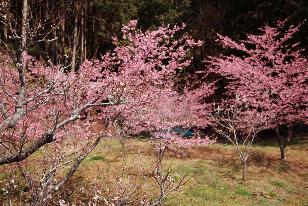 カンザクラをバックに白梅
