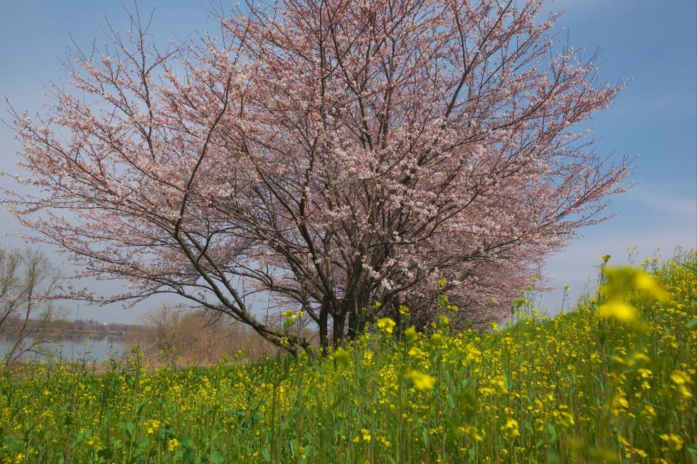 菜の花と桜が咲く堤防