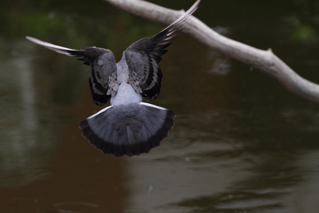 ハトがカワセミの枝に止ろうとしてる