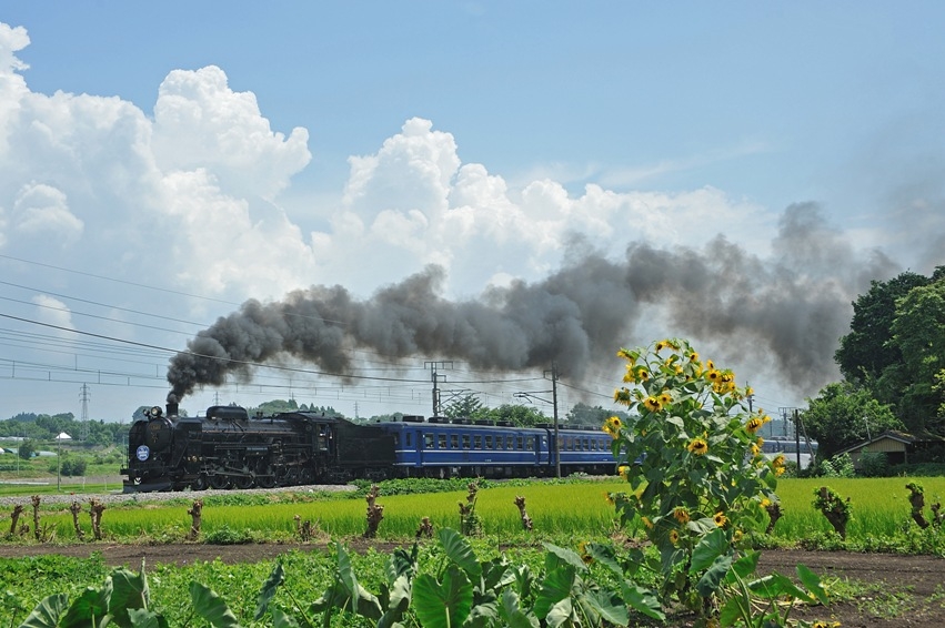 夏空、ヒマワリ、水田、蒸気機関車、、、ニッポンの夏