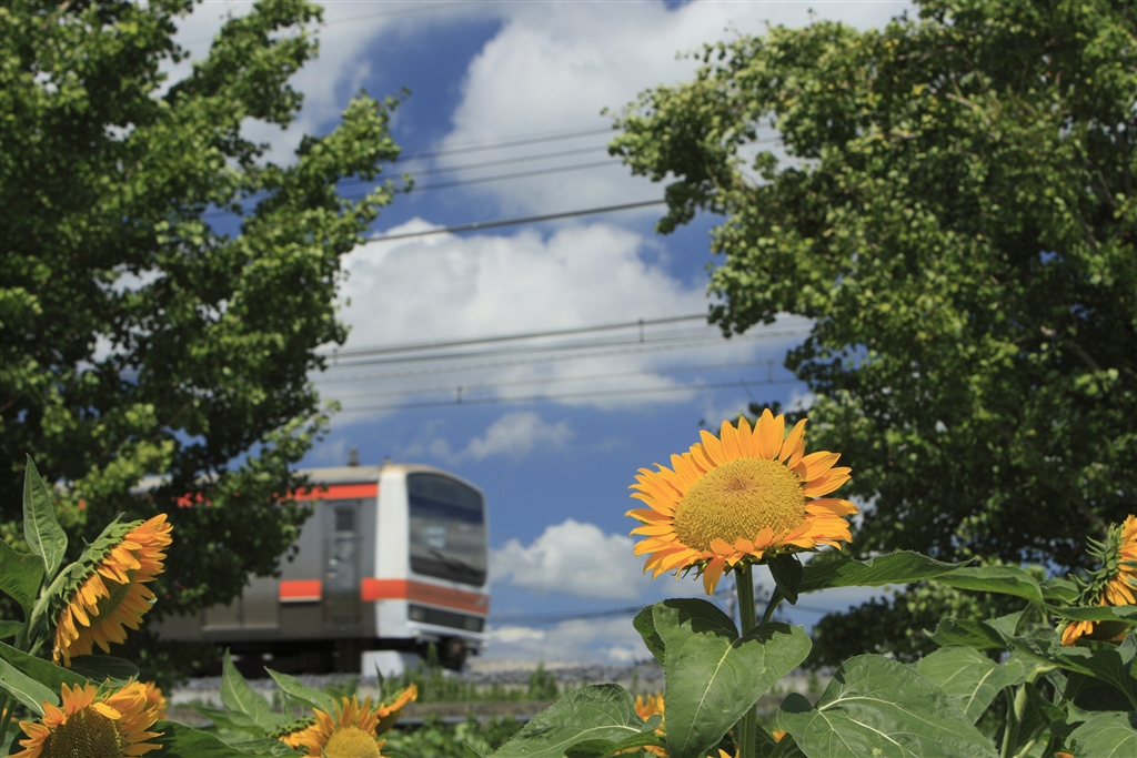 ヒマワリの色と電車のオレンジが似てる〜(~~)