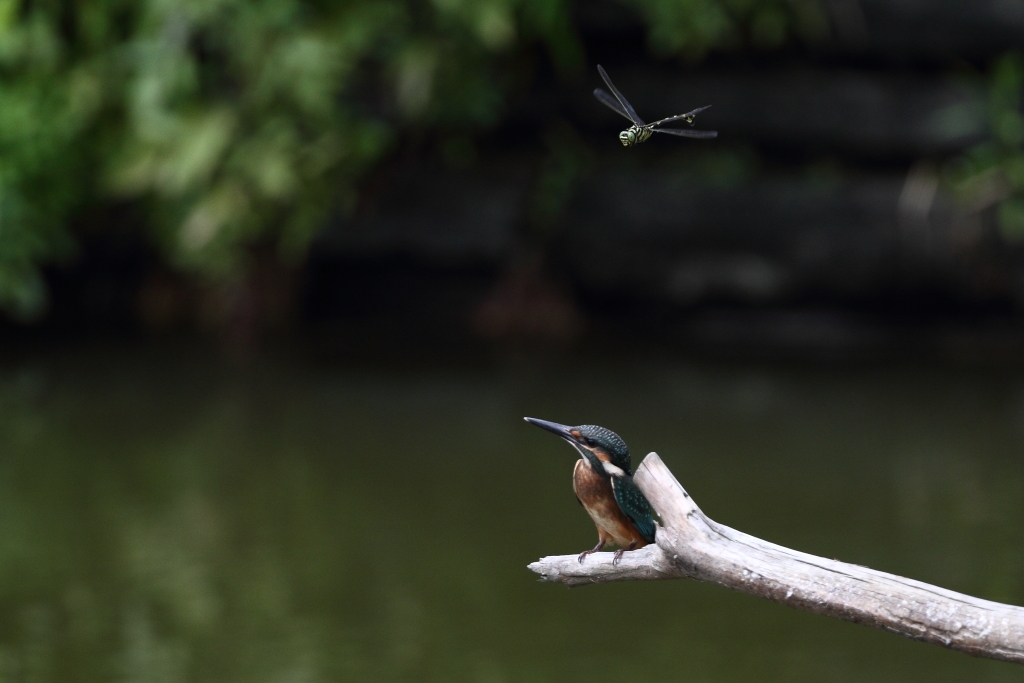 飛翔トンボとカワセミ幼鳥のコラボで