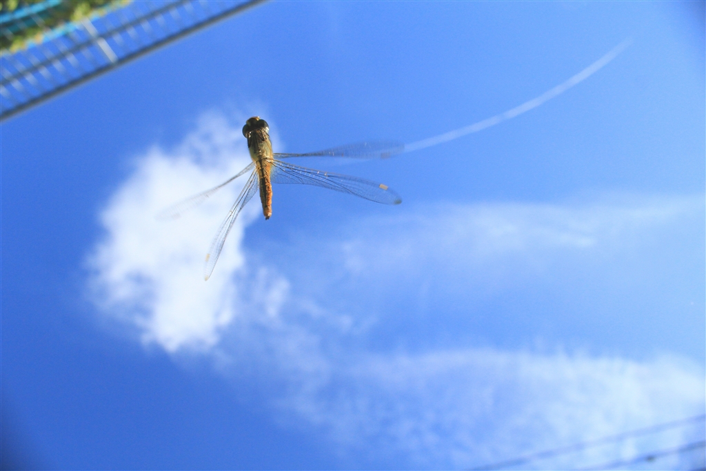 レンズの直前でヒョイと身をかわして上にターンしたウスバキトンボ
