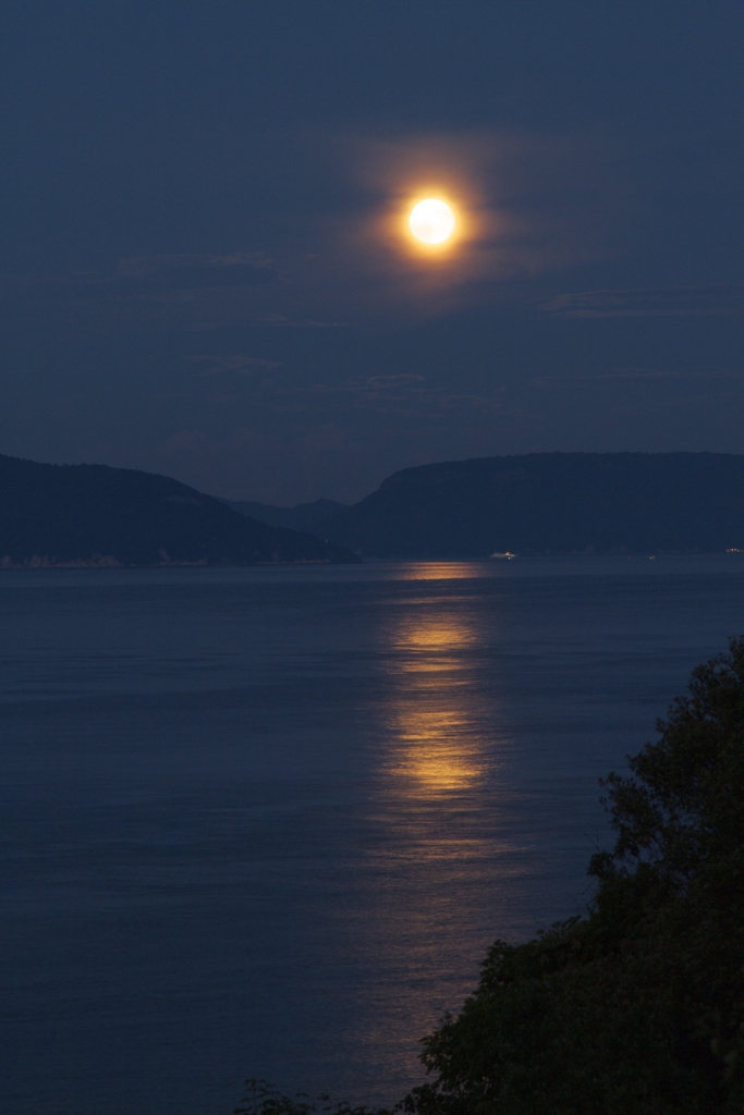 崇徳上皇ゆかりの地五色台から見た月 下に見えるのは、古戦場屋島です
