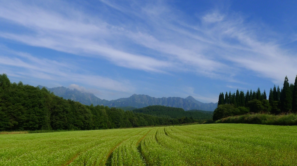 ソバ畑から望む戸隠連峰 右手の後方の三角の山は高妻山