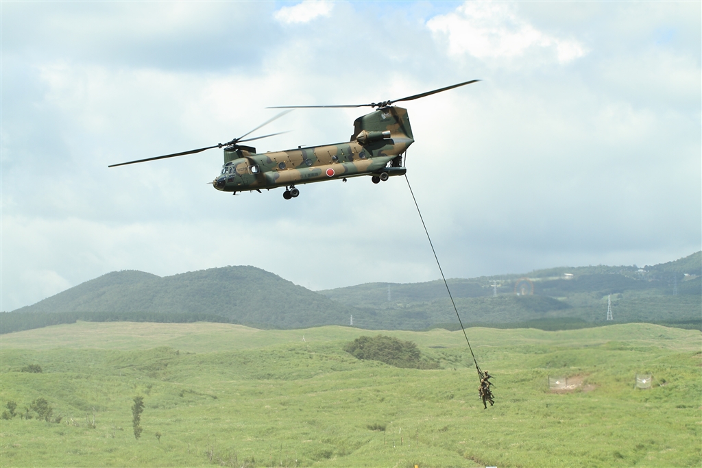 CH−47J(偵察隊員をぶら下げて戦場離脱)