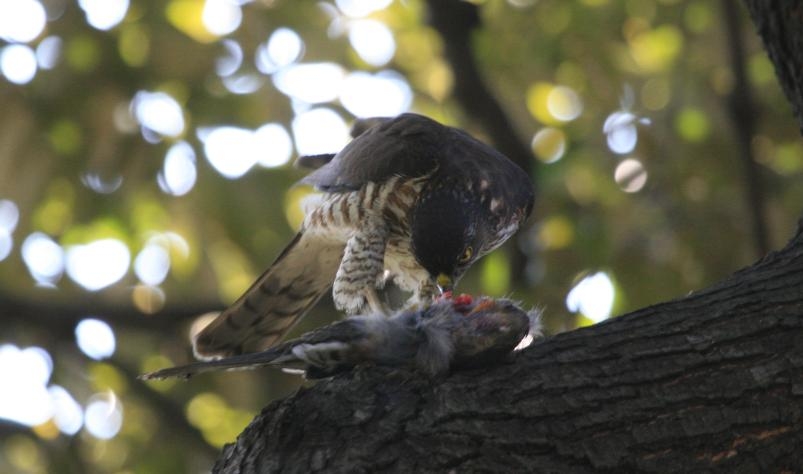 ヒヨドリを捕獲して枝にとまりお食事中