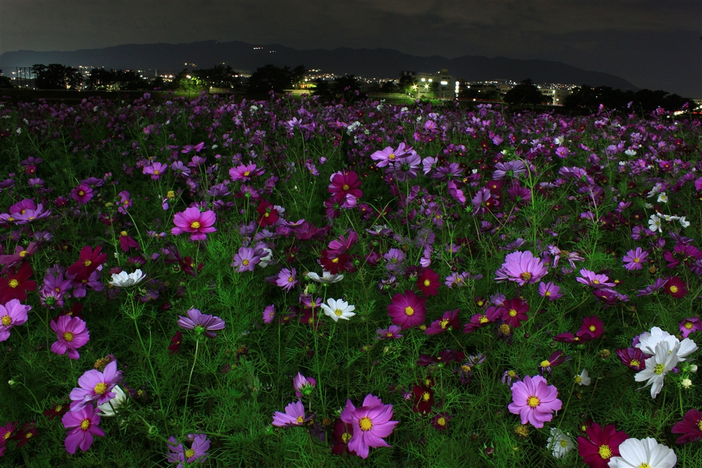 60WのLEDをあちこちに向けて照明した夜のコスモス畑