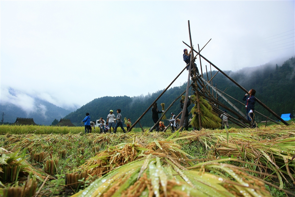 稲木(稲架木)に刈り取った稲穂を掛けて天日干しにする