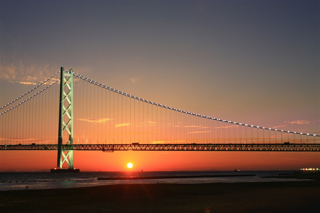 夕日の光景(17:43に撮影)に同じところの夜景(18:34に撮影)を重ね合わせた写真です