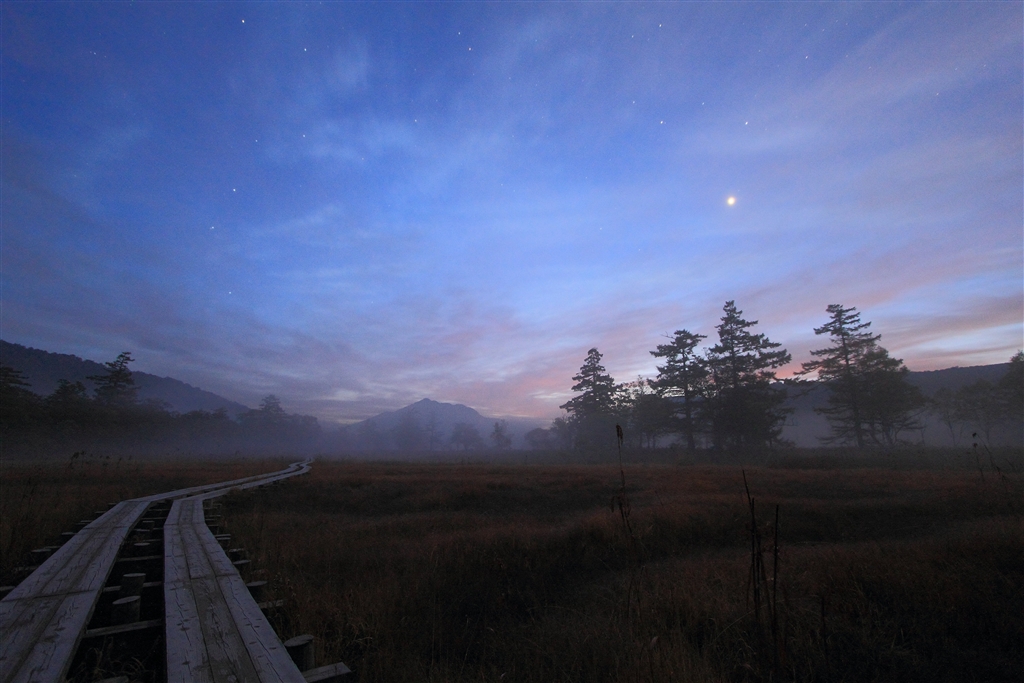 未明の尾瀬ヶ原はガスが懸かり晴れていれば星も景色も見えて綺麗な光景が広がる