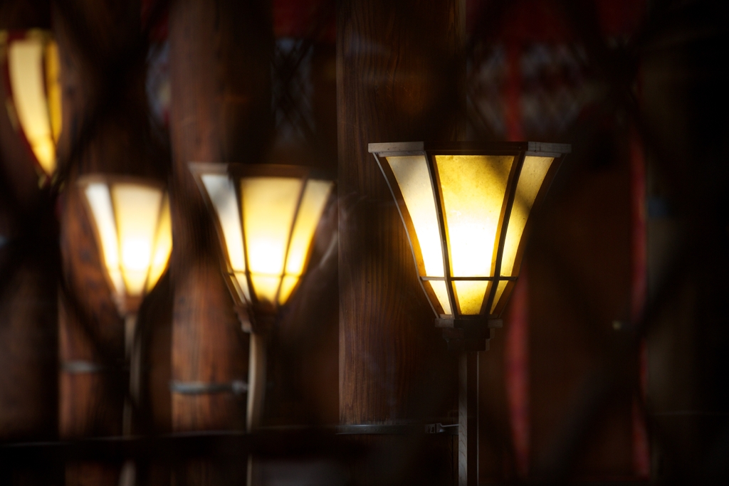 京都の下鴨神社:格子とガラス越しにぼんぼりを、