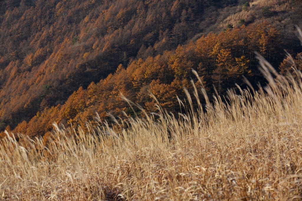 高ボッチより:ススキの向こうは唐松、、、