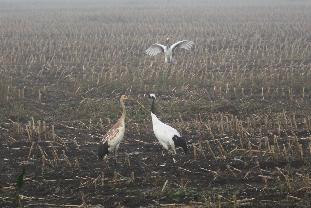 丹頂の親子です。たぶん奥から走ってくるのがお父さん鶴かな