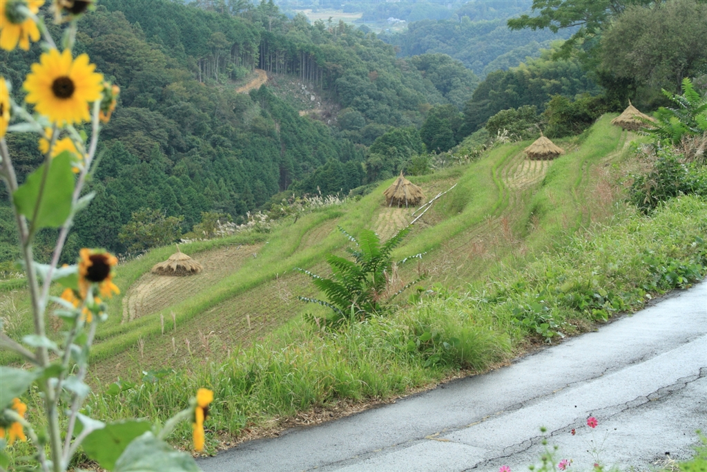 棚田に季節外れのひまわり