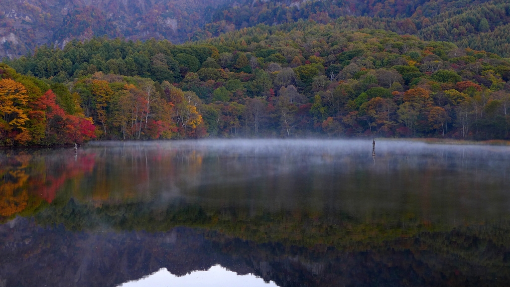 戸隠 鏡池 寒さで湖面から毛嵐が立ってます