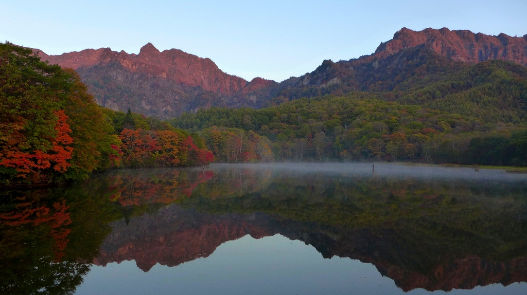 茜色に染まる戸隠連峰 左から 西岳 戸隠山
