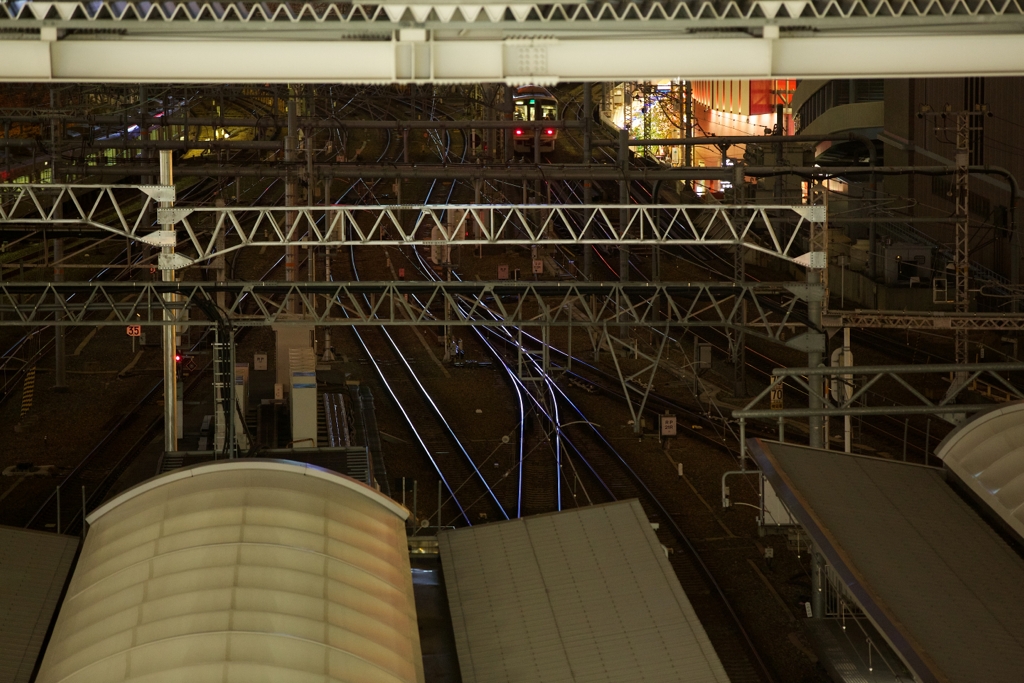 大阪駅より:レールが青く光っていました。