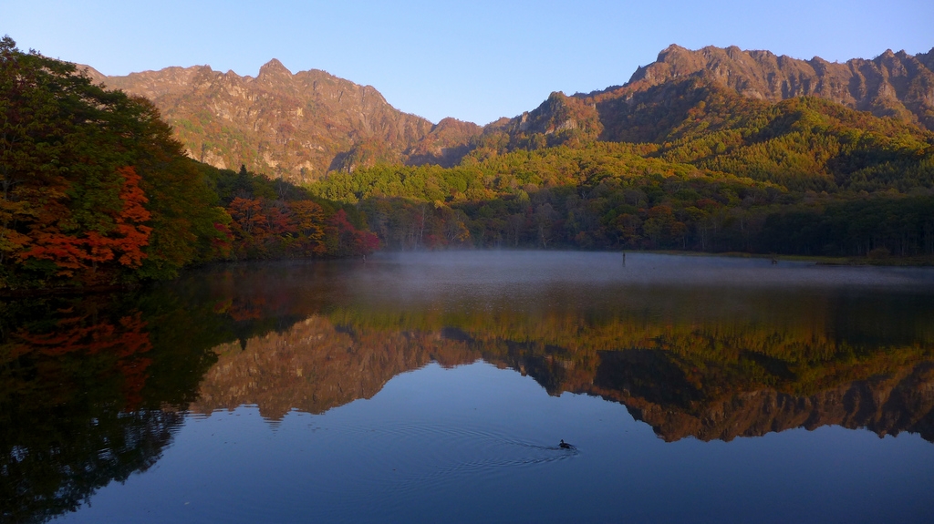 水場の紅葉とカモ 鏡池