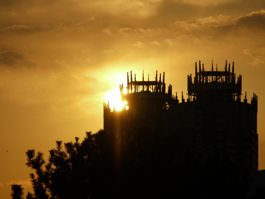 建築中のビルと夕焼け