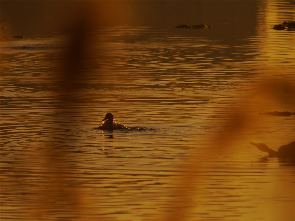 朝焼けの中ご飯?それとも水浴び?