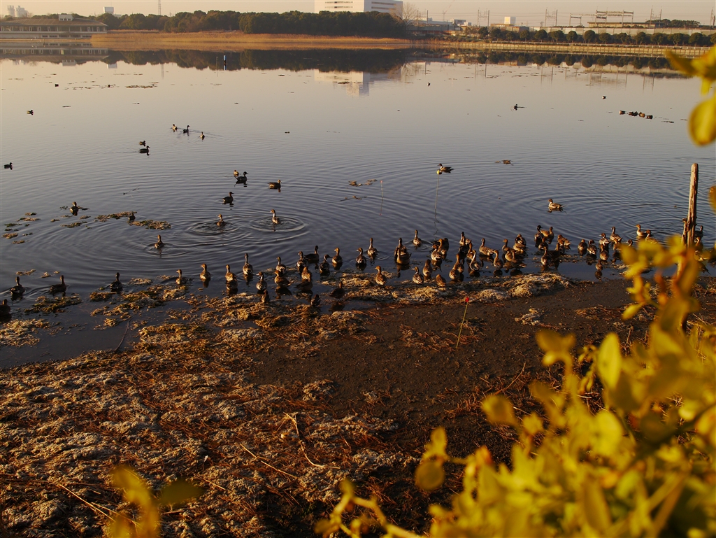 朝焼けの中の鴨たち。