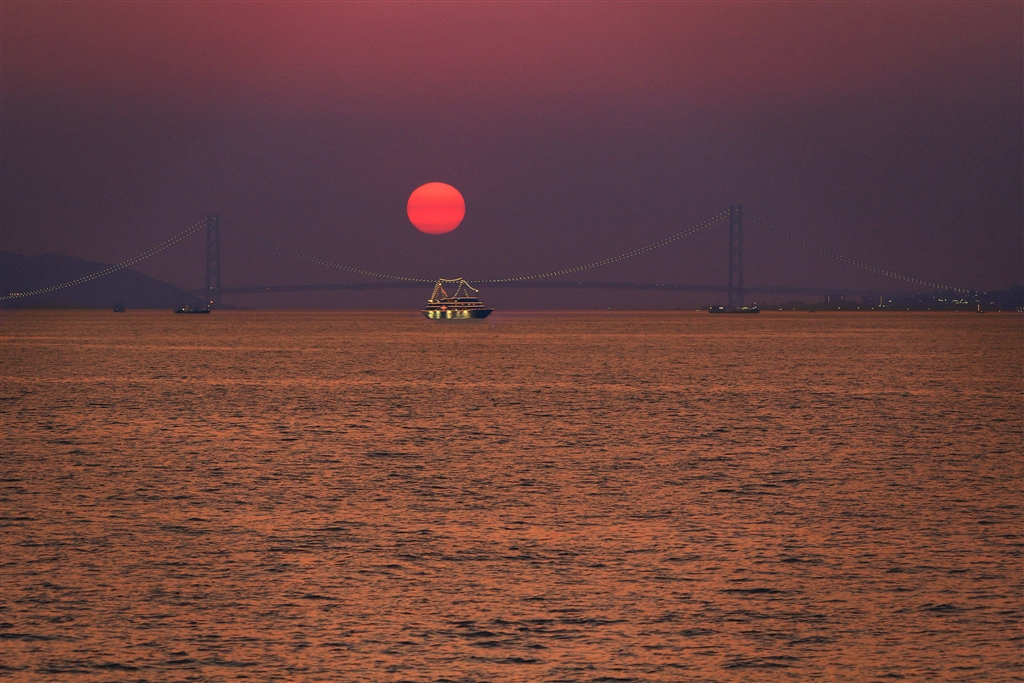明石海峡大橋の向こうに沈む今日の夕陽@ラヴィマーナ神戸(本文参照)