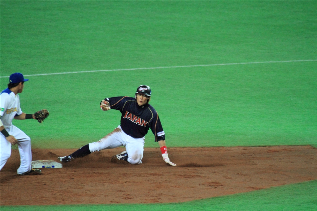 盗塁する、糸井選手。