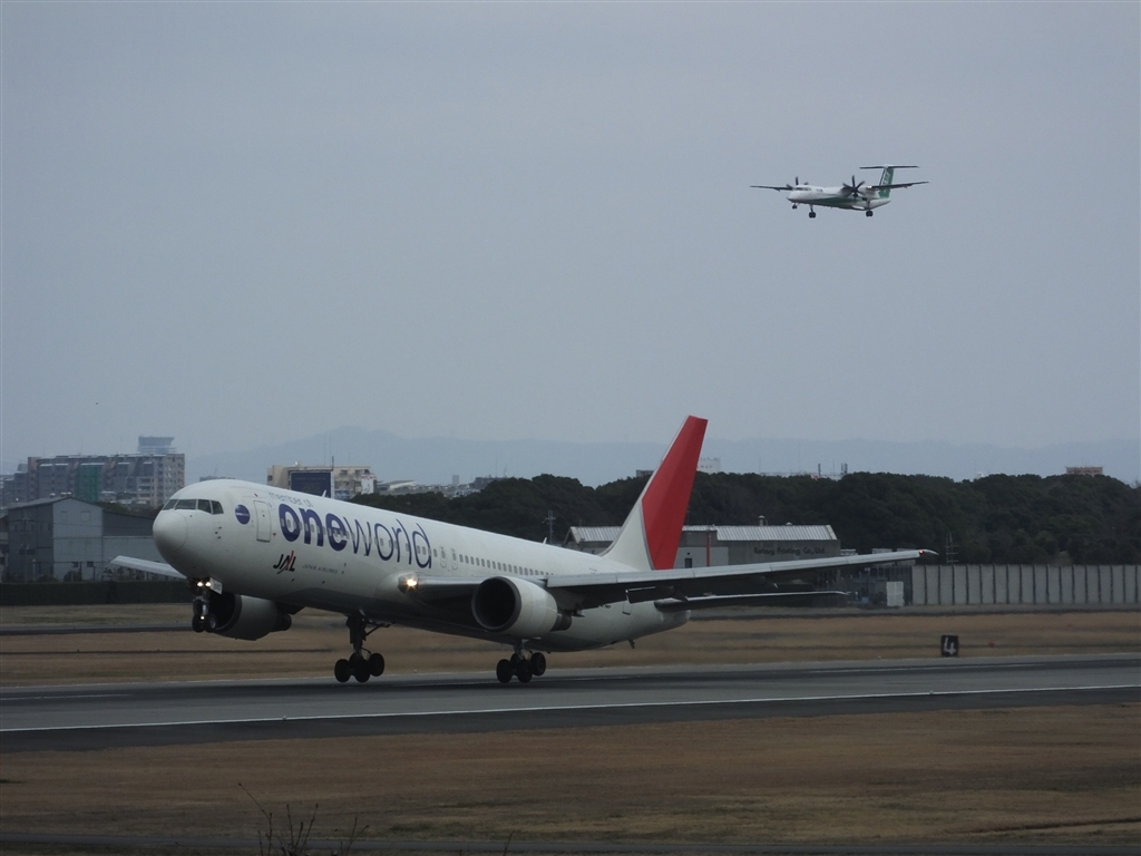 離陸する767と着陸するボンバルディア