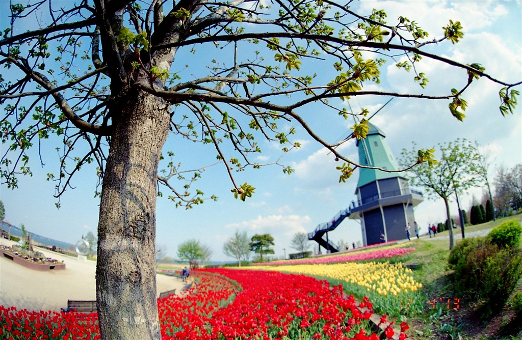 チューリップとオランダ型風車 F90XS+SigmaFisheye1528 Kodak Ultramax400